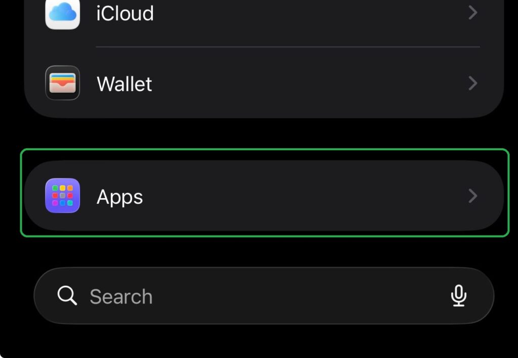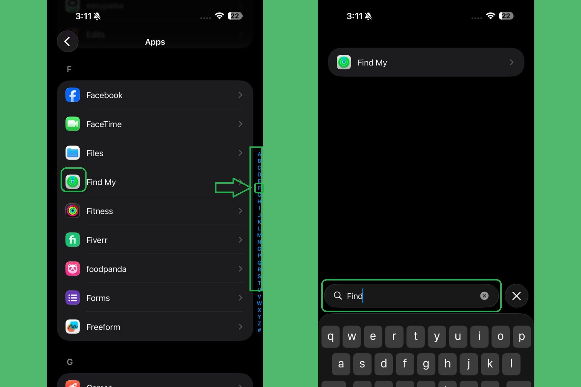 Step 3: Scroll to the letter F and tap Find My. You can also tap the search bar at the bottom and type Find My to find it faster.