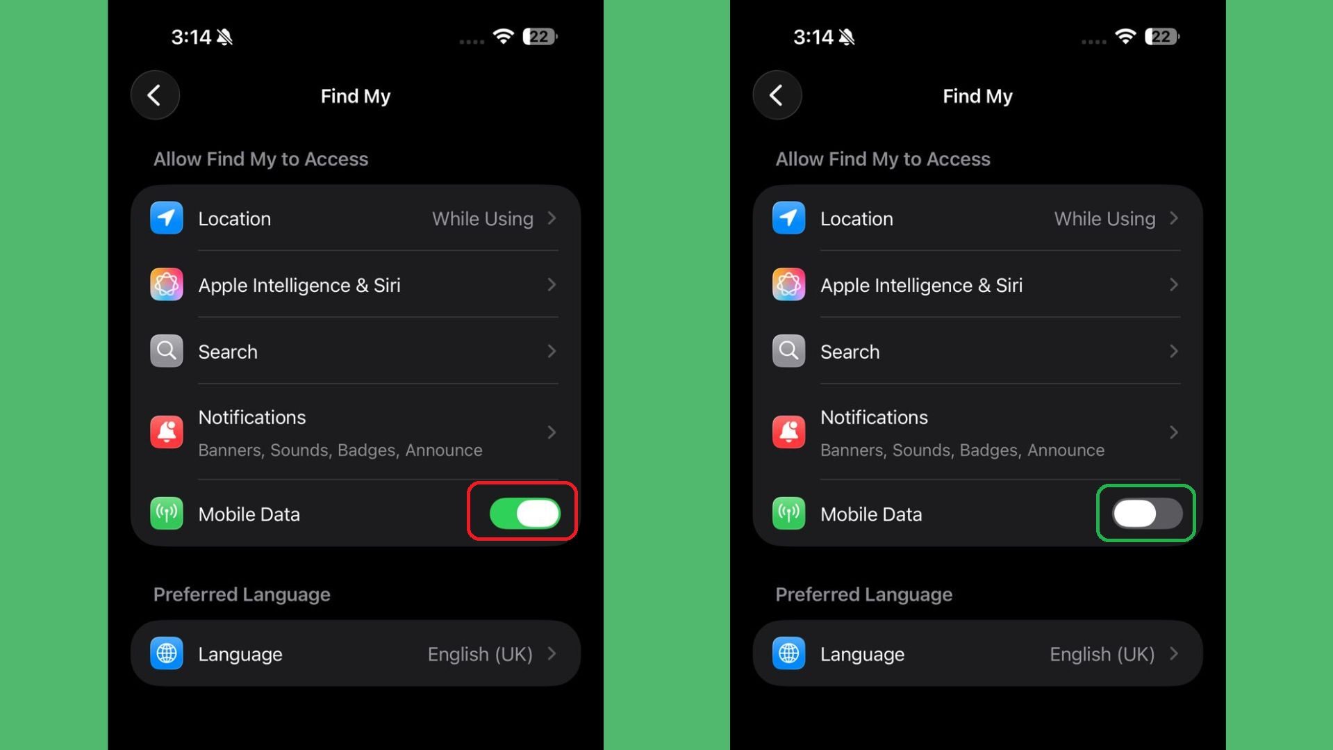 Instead of cutting all internet like Airplane Mode does, you remove Find My’s access to cellular data only. You can still text, call, browse, use WhatsApp, watch videos, and do everything else normally. Only Find My gets cut off.