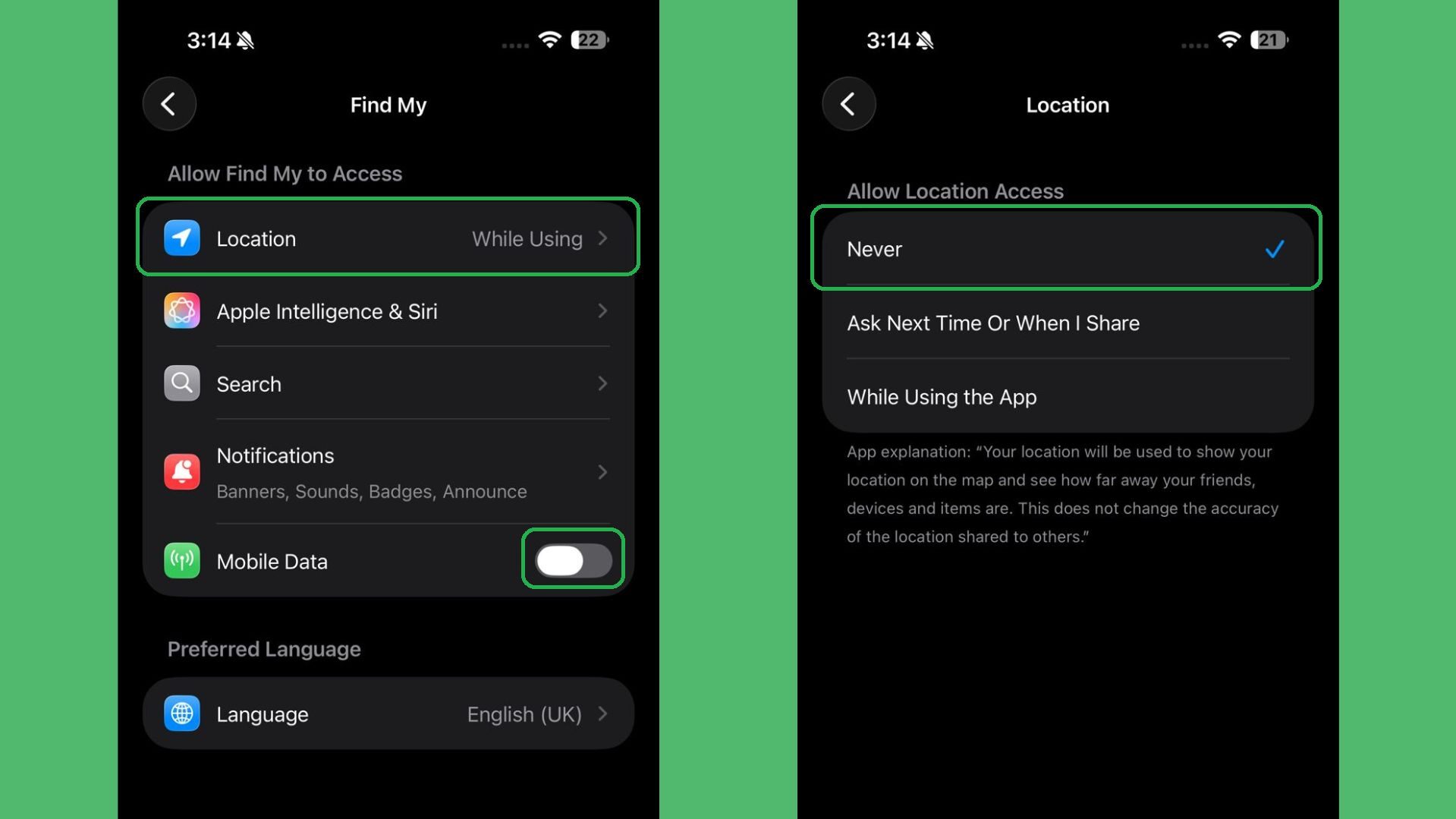 Important: If your phone connects to a Wi-Fi network, Find My might resume updating through Wi-Fi. Setting Location to Never in Step 5 stops that completely.
