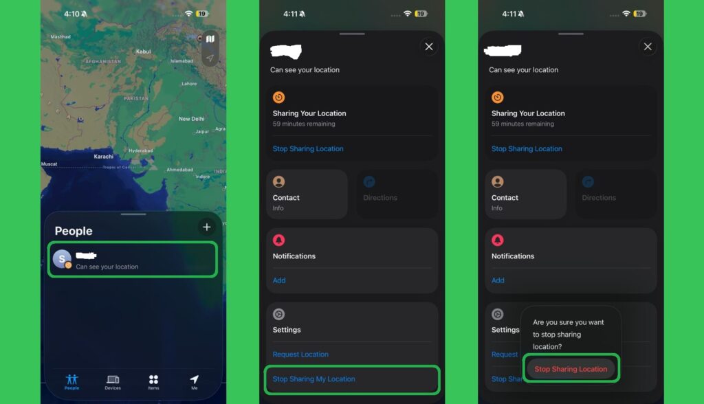 Stop sharing from one specific chat: Open the iMessage thread, tap their name, tap Stop Sharing My Location.